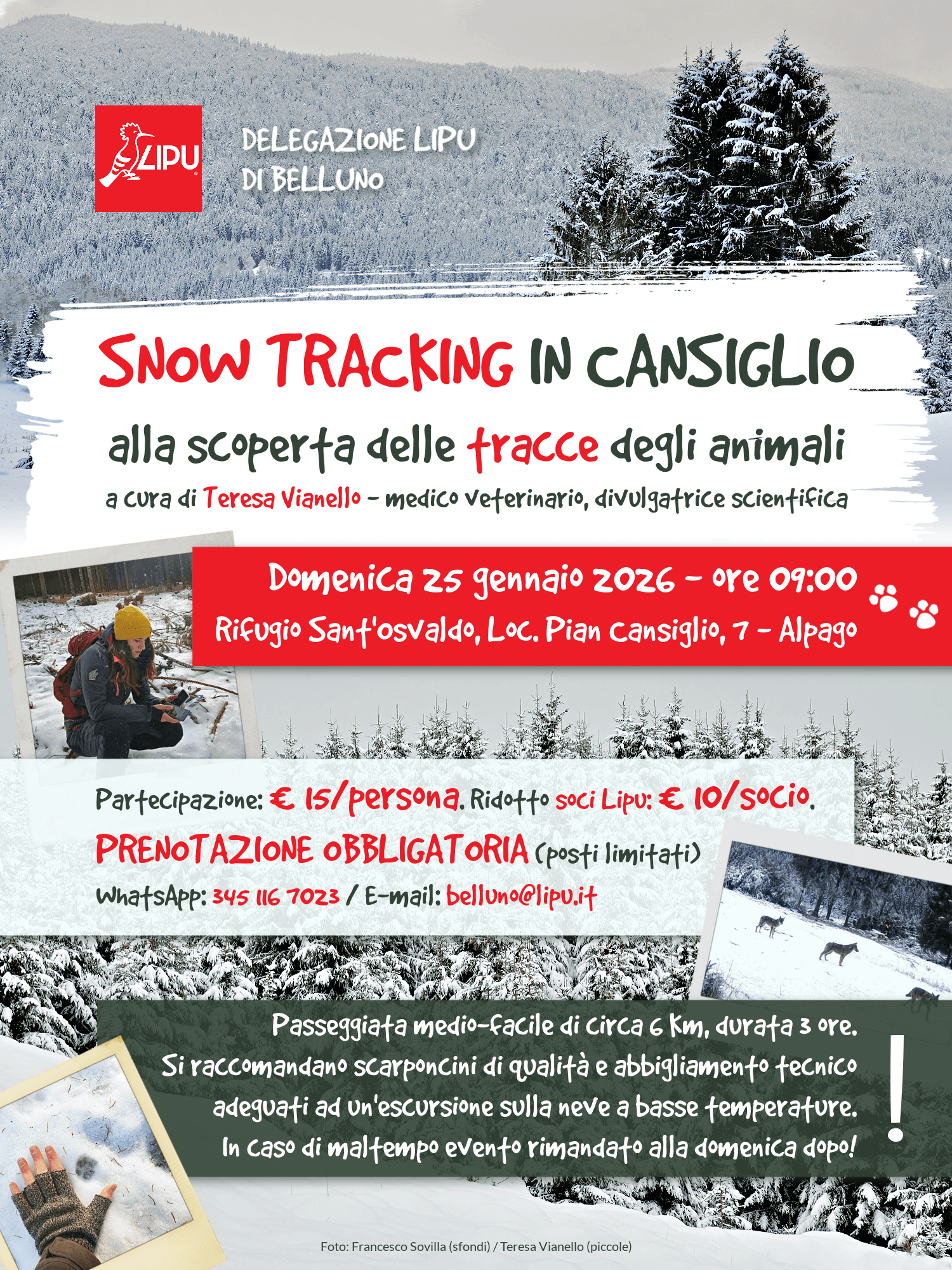 Attività di snow tracking guidata da Teresa Vianello in Cansiglio il 1 febbraio 2026, con partenza alle 09:00 dal Rifugio Sant’Osvaldo. Durata di circa 3 ore, costo di partecipazione €15…
