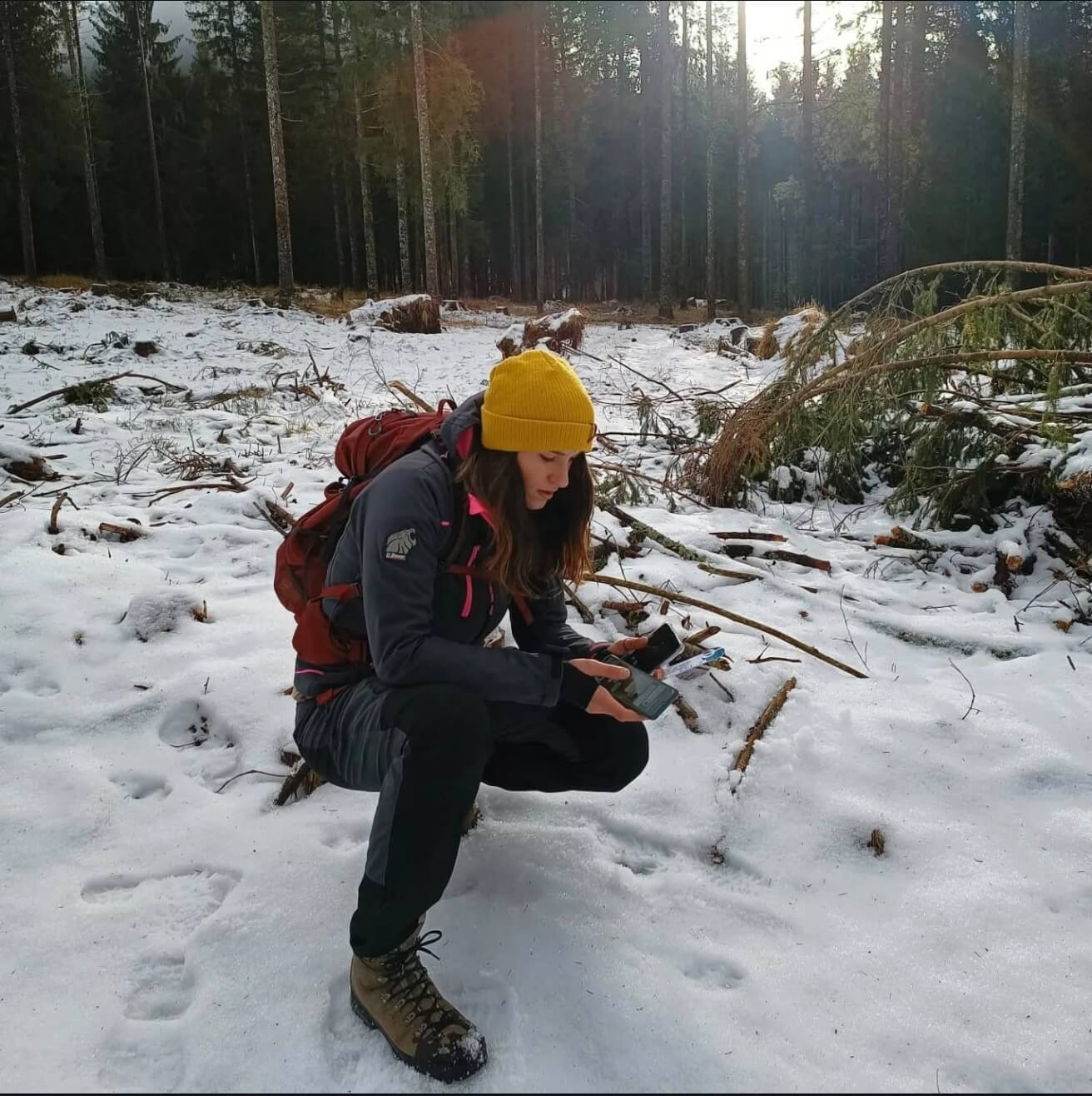 La nostra guida Teresa Vianello durante lo studio di tracce sulla neve in Cansiglio.