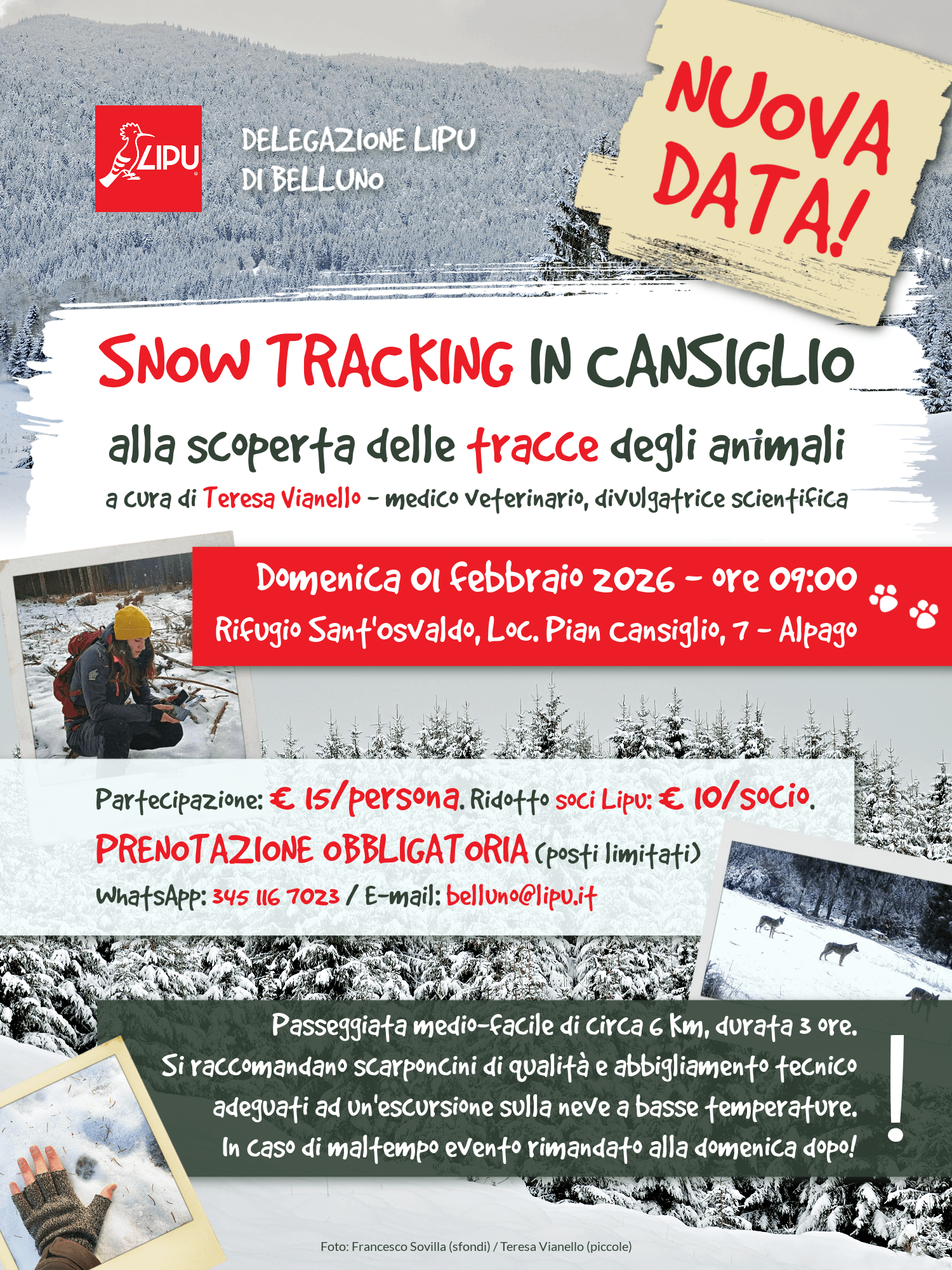 Domenica 01 febbraio 2026 andremo insieme alla ricerca delle tracce bianche, le piste lasciate dagli animali sulla neve. Seguiremo le impronte, ne analizzeremo le diverse forme, dimensioni e distanza, per identificare l’animale e studiarne la velocità e il comportamento, guidati da un’esperta: Teresa Vianello, medico veterinario, Natural Tracker certificata, addetta al monitoraggio della fauna selvatica proprio in Cansiglio.