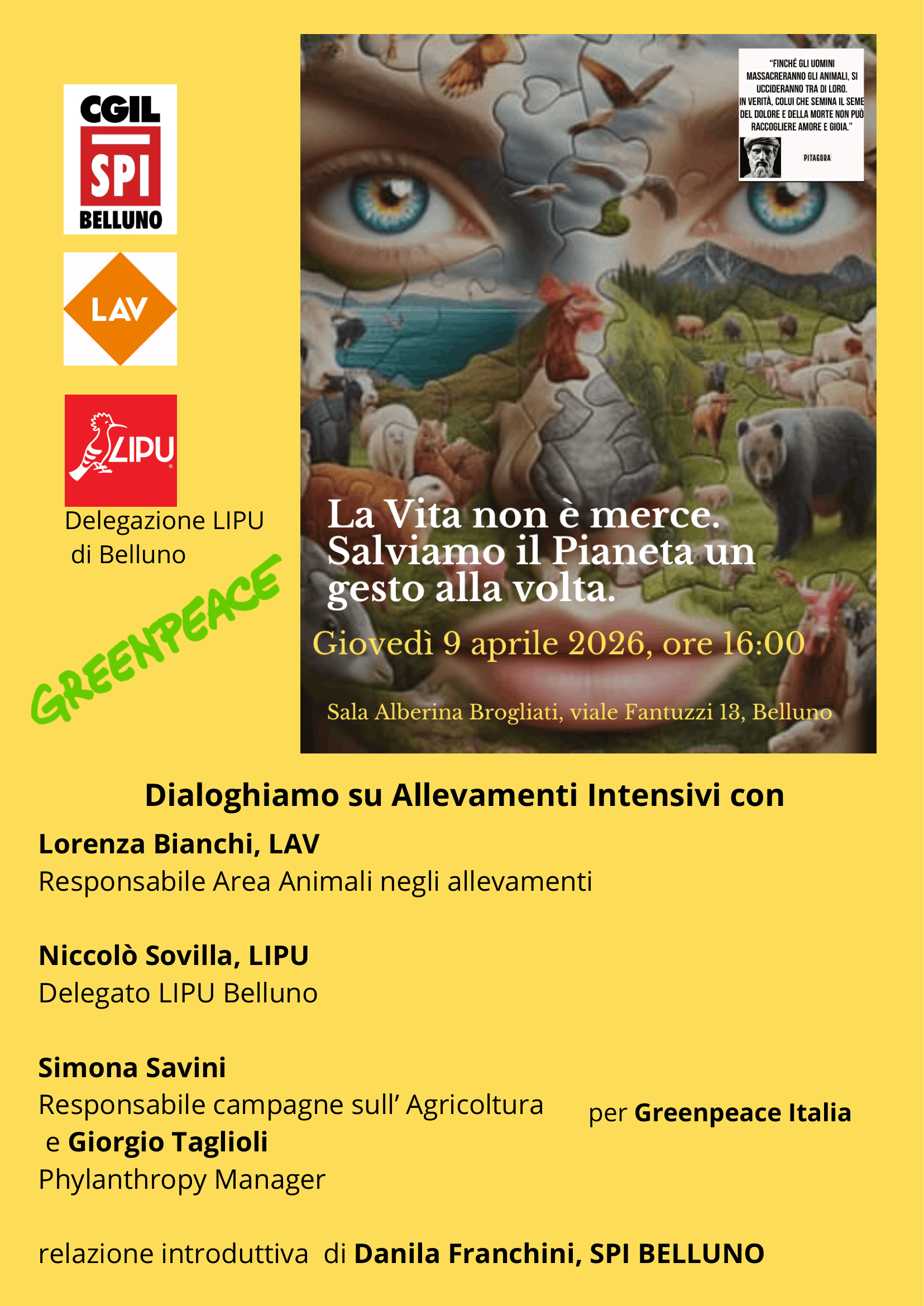 Lo SPI CGIL Belluno, in collaborazione con LAV, Greenpeace e la Delegazione Lipu di Belluno propone un incontro sul tema degli allevamenti intensivi dal titolo “La vita non è merce. Salviamo il pianeta un gesto alla volta“.